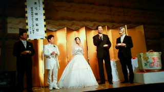 写真左から:真弓監督、新郎、新婦、