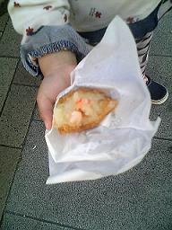 会場で売ってた"大車海老コロッケ"(130円)でご機嫌とり。